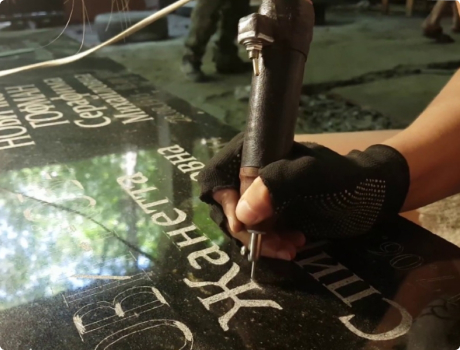 Мастер занимается ручной гравировкой текста. Для этого он использует специальный инструмент и трафарет. Сегодня на смену этому методу пришло современное оборудование, предназначенное для этой цели. Однако ручная гравировка по-прежнему актуальна для надгробий, где требуется дополнительная информация.